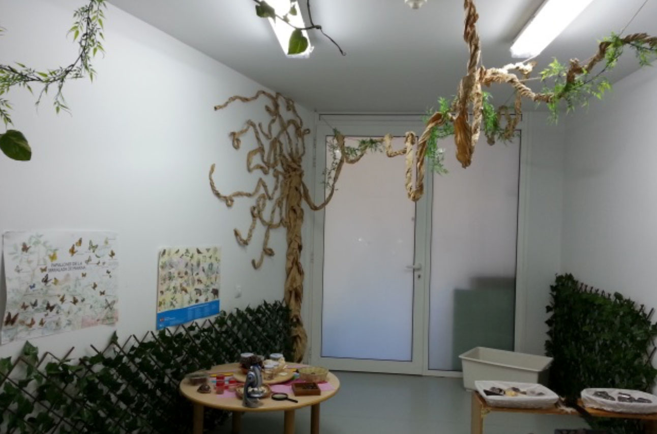 Aquest espai s’organitza en diferents contextos amb materials específics per a cada un d’ells. En el context sensorial, està format per diferents olors, pedres minerals i closques, que permeten obtenir diferents sensacions al tacte. També hi ha canyes de bambú per gaudir del so que proporcionen. Dins el context d’observació, trobem un microscopi i lupes per observar els diferents elements de la natura, que durant tot el curs escolar anirem obtenint aprofitant les diferents estacions de l’any. En el context de descans trobem diferents llibres i contes relacionats amb la natura, per tal que els infants, puguin establir connexions entre el que manipulen, observen i el que veuen. I per acabar, en el context de manipulació caixes amb diferents materials per poder manipular i experimentar amb elles.